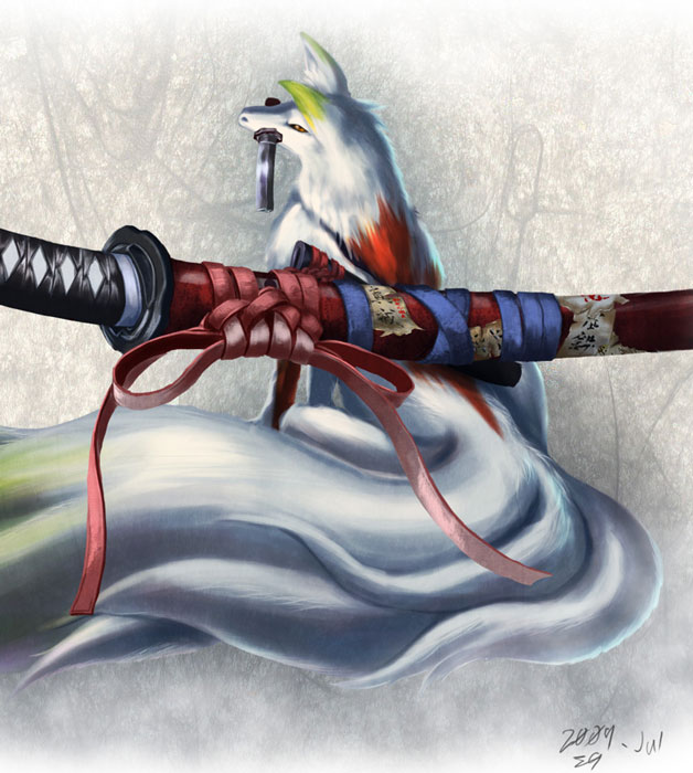 背中のでっかい刀に宿ったおバカ妖獣。人の言葉も理解するしとんでもなく強いんだけどいかんせんおバカ。